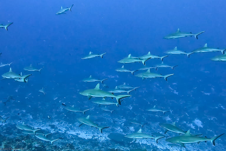 In Fakarava, it’s all about the sharks. The South Pass is said to have the highest concentration of sharks anywhere in the world. After entering the water at one end of the pass, we descended to 80 feet and were met by the largest group of sharks I’ve ever encountered. Swimming upstream at the same speed as the current, they appeared to be hovering in place while we floated by. We were completely surrounded by hundreds of sharks. Not to worry, though. Sharks are night feeders, so these sharks were completely chill. It was an unforgettable experience!