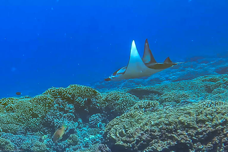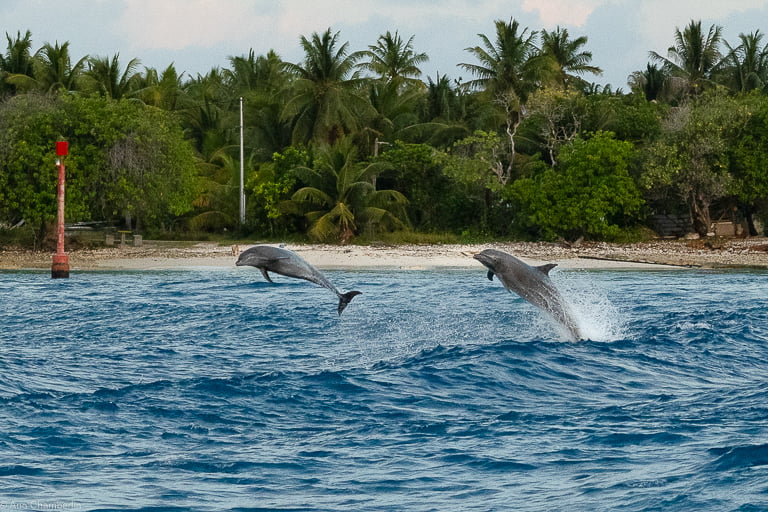 The extremely strong currents in the passes create an abundant food supply, which then attracts lots of fish. This in turn attracts lots of big predators, like sharks, dolphins and rays. In Rangiroa, we saw lots of fish, sharks and rays while diving the Tiputa Pass.